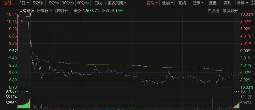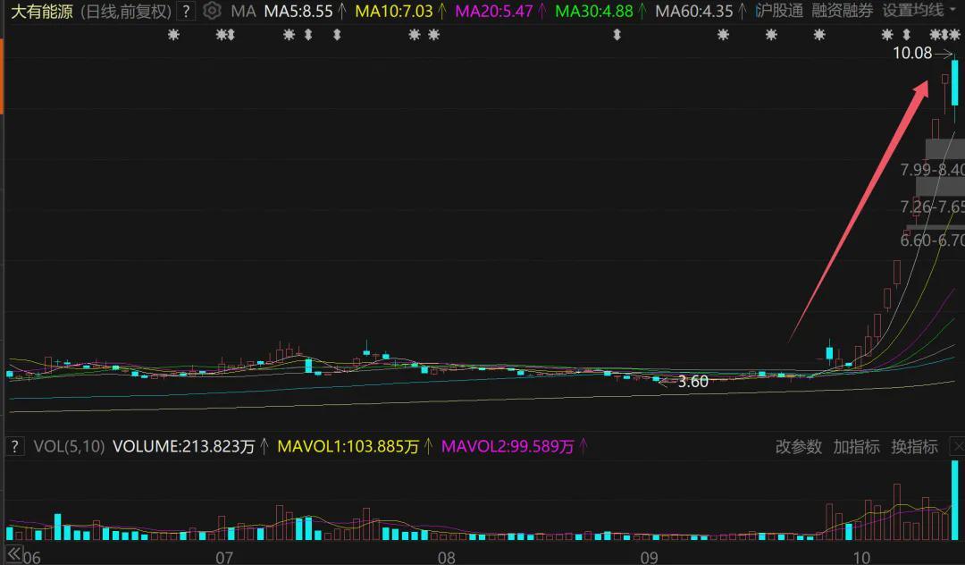 在这轮煤炭股行情中,大有能源(600403.SH)以10天9涨停的惊人表现成为市场焦点。数据显示,10月10日至23日期间,该股累计出现9个涨停板,其中10月14日至23日更实现连续8个涨停,股价从3.92元飙升至9.65元,短期涨幅达146%。若将9月26日的横盘突破涨停纳入统计,截至10月24日盘中10.08元高点,累计涨幅已达173%。