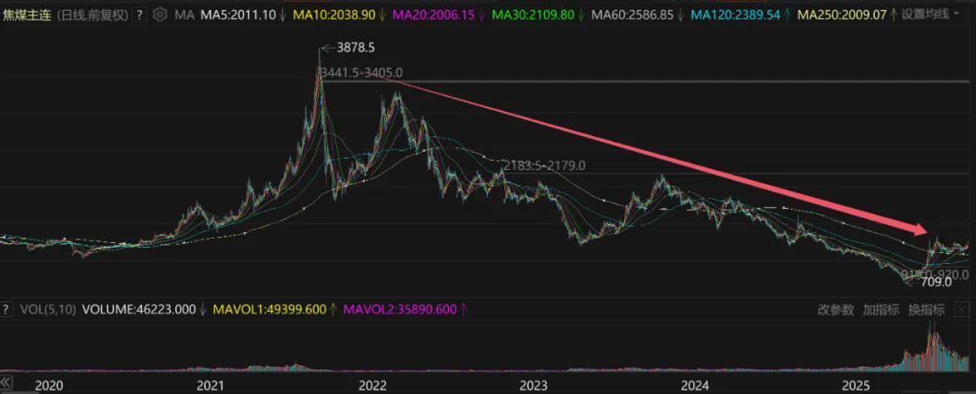 业绩下滑的主因是煤炭价格深度调整。以焦煤期货主力合约为例,价格从2021年10月的3878.5元/吨历史高位,跌至2025年6月初的709元/吨,累计跌幅达82%。虽然6月以来随着行业政策调整,焦煤期货反弹至1250元/吨附近,但上半年价格销量双降已对公司造成实质性冲击。