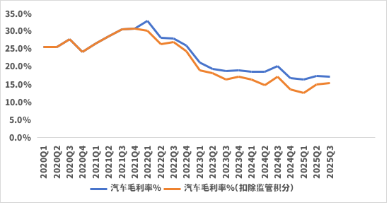 但弊端也持续显现。尽管收入大超预期,但本季度汽车业务毛利率仍维持低位,三季度剔除监管积分后的汽车毛利率仅为15.4%,同比下降了1.7个点,大幅低于市场预期的16.3%。