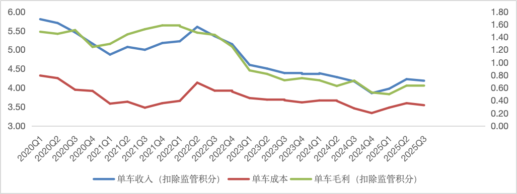 从单车经济角度看,三季度特斯拉的单车均价为4.18万美元,同比仅微增0.4%,显著低于历史均值。同时,受关税冲击,本季度单车成本却增长了2.4%,最终导致当期单车毛利降到0.64万美元,同比下滑近10个点。