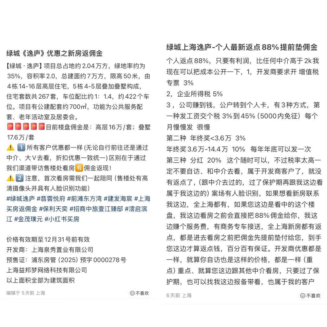 记者注意到,在互联网平台,已经有不少中介发帖,称绿城逸庐已经在10月启动分销,返佣后可优惠6万元至10万元,另有人留言称“现在开了渠道,佣金十几万”。还有中介给出了更为具体的返佣方案,表示高层佣金为16万元/套,叠墅产品17.6万元/套。