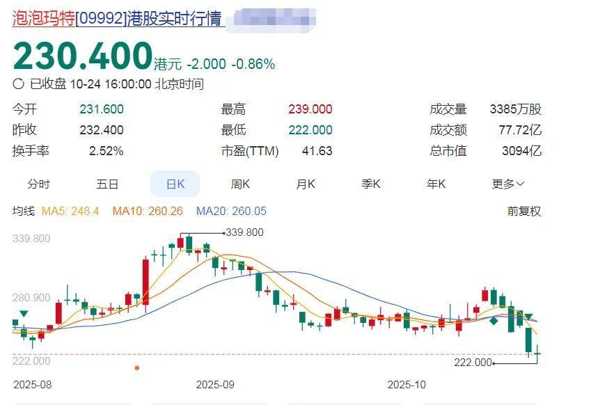 截至昨日(10月24日),泡泡玛特的股价(最新报232.4元)已连续6个交易日下跌,引发市场广泛关注。从10月17日至24日,其股价跌幅超过20%,若与两个月前339.8元的高点相比,跌幅更为显著。这一波动让不少股民在股吧中直呼“哭死了”,纷纷质疑泡泡玛特的经营状况。