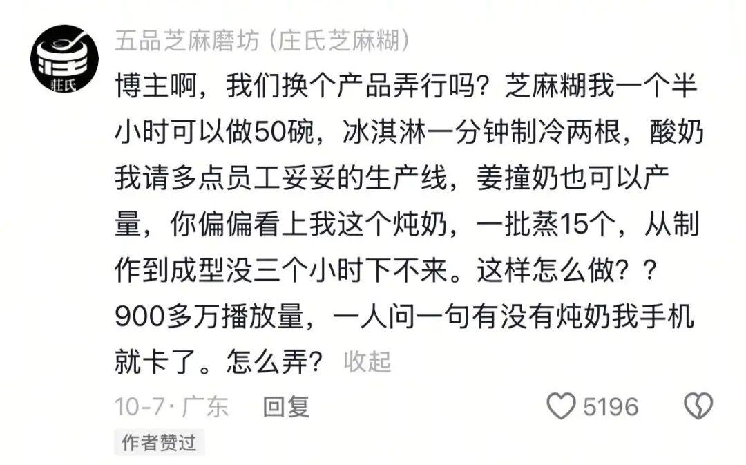 更有趣的是,门店老板在热度发酵短短两天后,跑到原博主评论区下“诉苦”,称:黑芝麻糊炖奶制作工艺复杂、周期长——从制作到成型要花费超三小时,而且每一批只能做15个,一天总量不超过45份。面对源源不断的顾客,门店实在难以承接。