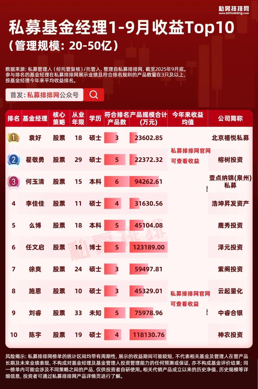 截至2025年9月底,来自20-50亿私募且“在私募排排网有3只及以上的私募产品有业绩展示”的基金经理共有78位。