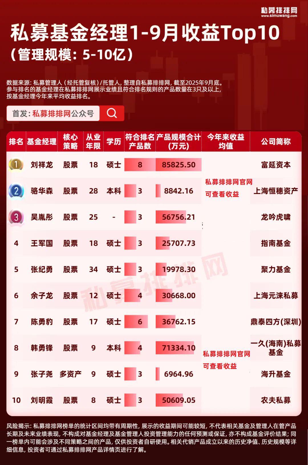 截至2025年9月底,来自5-10亿私募且“在私募排排网有3只及以上的私募产品有业绩展示”的基金经理共有98位。