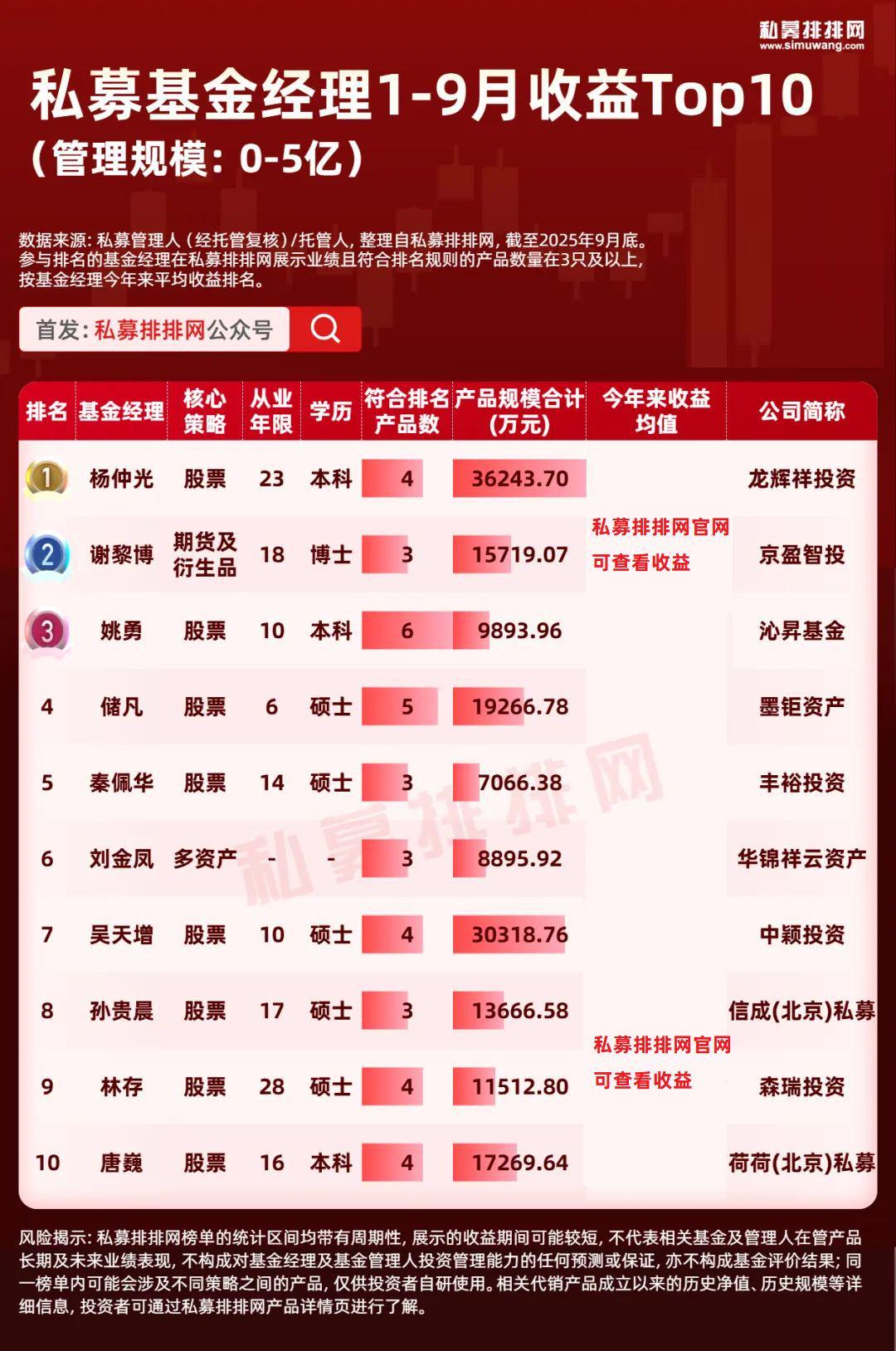 截至2025年9月底,来自0-5亿私募且“在私募排排网有3只及以上的私募产品有业绩展示”的基金经理共有187位。