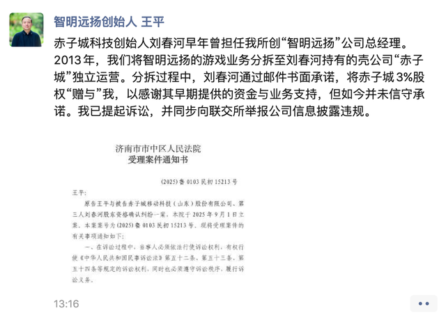2025年10月21日,王平在微信朋友圈发文称,其已经起诉赤子城、及其创始人刘春河。“赤子城科技创始人刘春河早年曾担任我所创‘智明远扬’公司总经理。2013年,我们将智明远扬的游戏业务分拆至刘春河持有的壳公司‘赤子城’独立运营。分拆过程中,刘春河通过邮件书面承诺,将赤子城3%股权赠与我,以感谢我对其早期提供的资金与业务支持,但如今并未信守承诺。我已提起诉讼,并同步向联交所举报公司信息披露违规。”