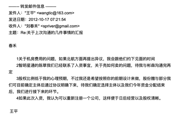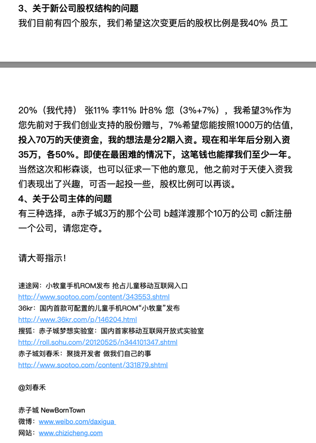 “这个方案让我继续投资,且我是一个相对持小股关系,我不同意。”王平拒绝了增资方案。在2012年10月17日的回复中,王平写道:“股权比例低于我的心理预期,不过我还是希望按照你的前期设计(即方案a用赤子城公司)来做,股份赠与部分我们可目前确定主体后通过协议明确下来,待我们确定选择主体以及我们今年资金分配结束后,我们进行接下来的环节。”而且,王平还建议“重新注册公司便于股权清晰”,不过刘春河认为已有赤子城这个现成公司,无需再注册新公司。