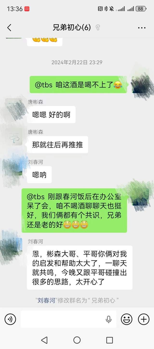 实际上到2024年2月22日,双方仍关系良好,彼此间常常沟通交流。在2024年2月22日,在早年刘春河、唐彬森、王平等人共同的群聊中,刘春河说道:“彬森大哥、平哥,你俩对我的启发和帮助太大了。”而且,刘春河还将群名修改为“兄弟初心”。