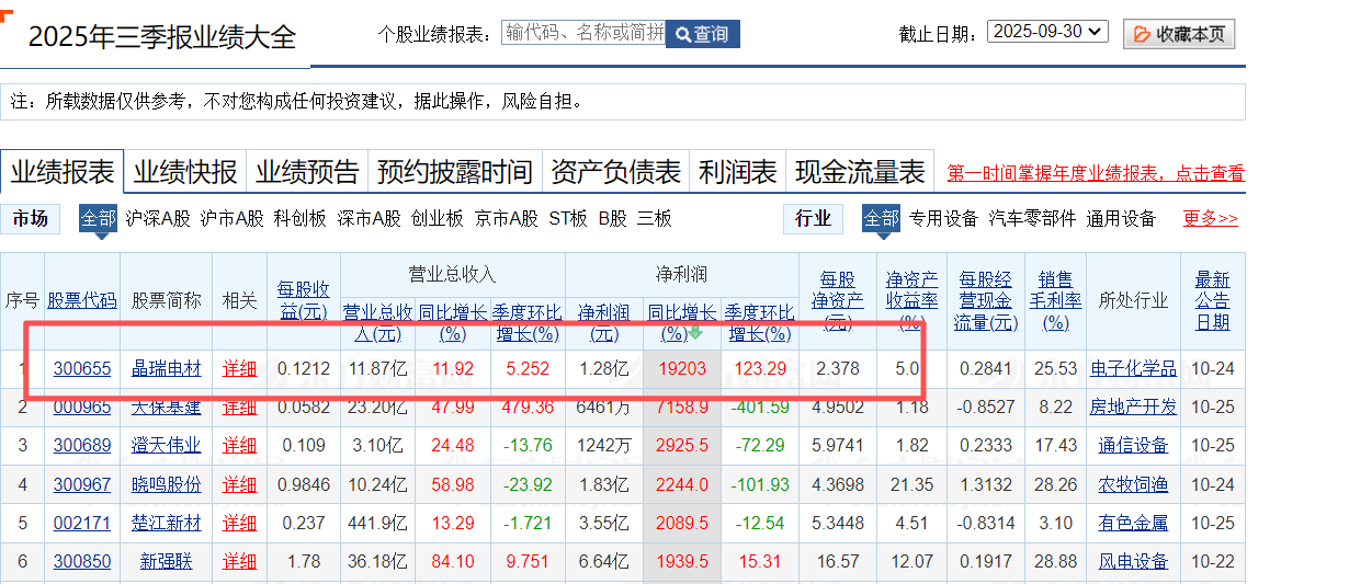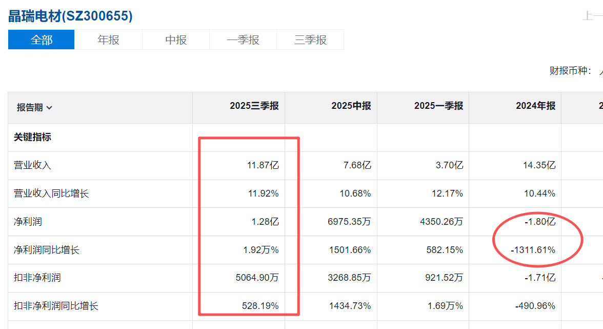 10月23日,晶瑞电子材料股份有限公司(下称,晶瑞电材)发布的三季度财报引发市场震动。数据显示,2025年前三季度,公司实现营收11.87亿元,同比增长11.92%;净利润达1.28亿元,同比增幅高达19202.65%,一举成为沪深两市净利润同比增长的领跑者。