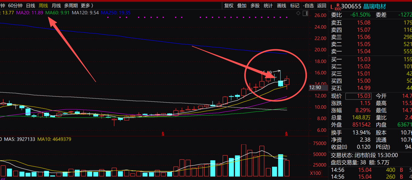 然而,这份亮眼的财报发布后,资本市场反应却呈现分化。10月24日,晶瑞电材股价大幅高开,盘中涨幅一度近12%,但最终收盘涨幅收窄至8.29%,未能封板。值得注意的是,当日科技股在国产替代利好刺激下大面积涨停,而晶瑞电材的表现略显平淡。截至收盘,其股价为15.03元/股。