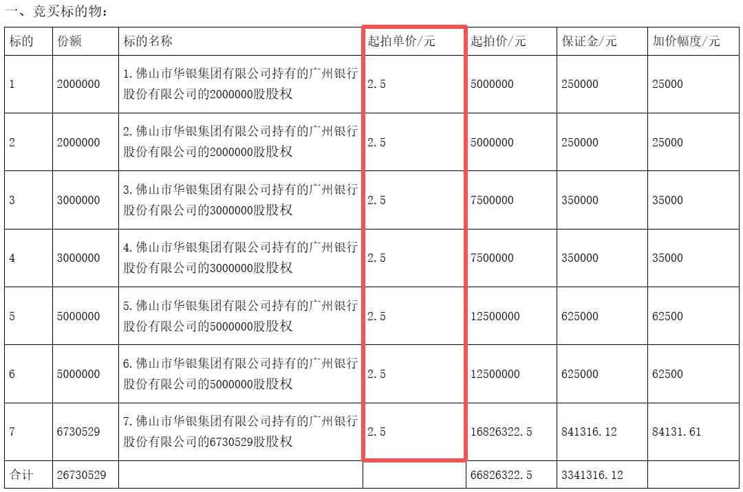 (图 / 佛山市华银集团第二次将股权拆分7笔的拍卖价格(来源:京东司法拍卖平台))