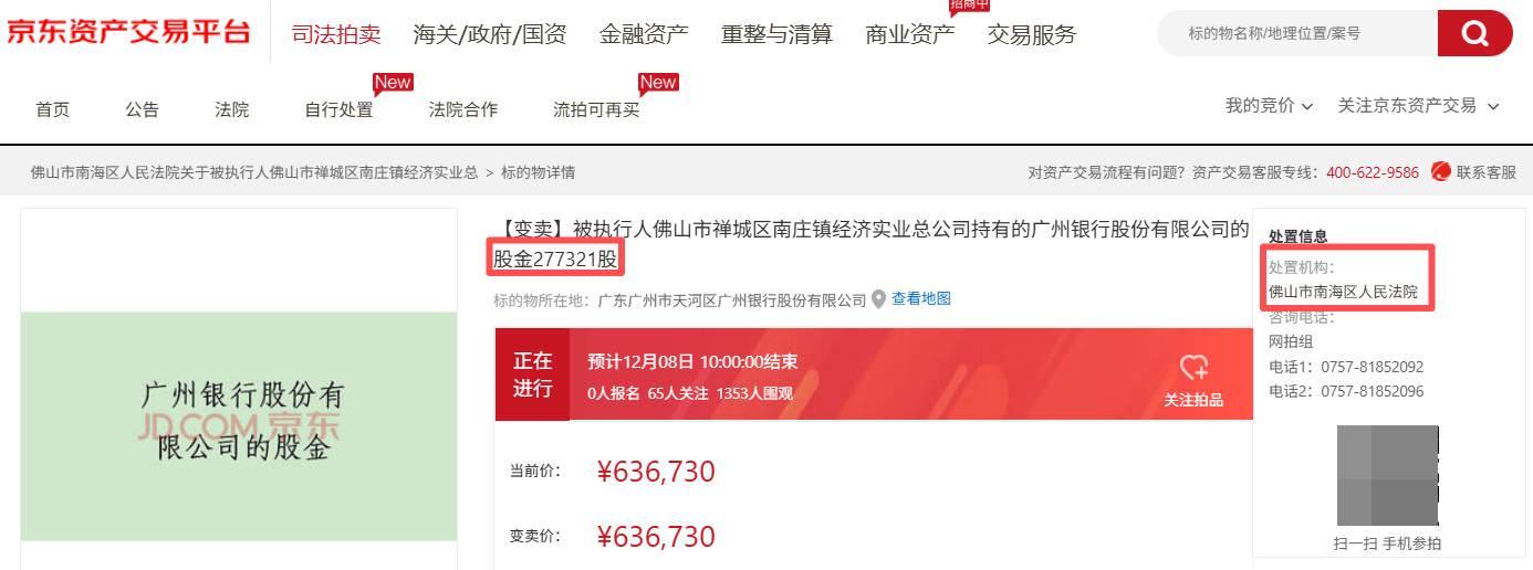 (图 / 佛山市禅城区南庄镇经济实业总公司持有广州银行股权的司法拍卖公告(来源:京东司法拍卖平台))