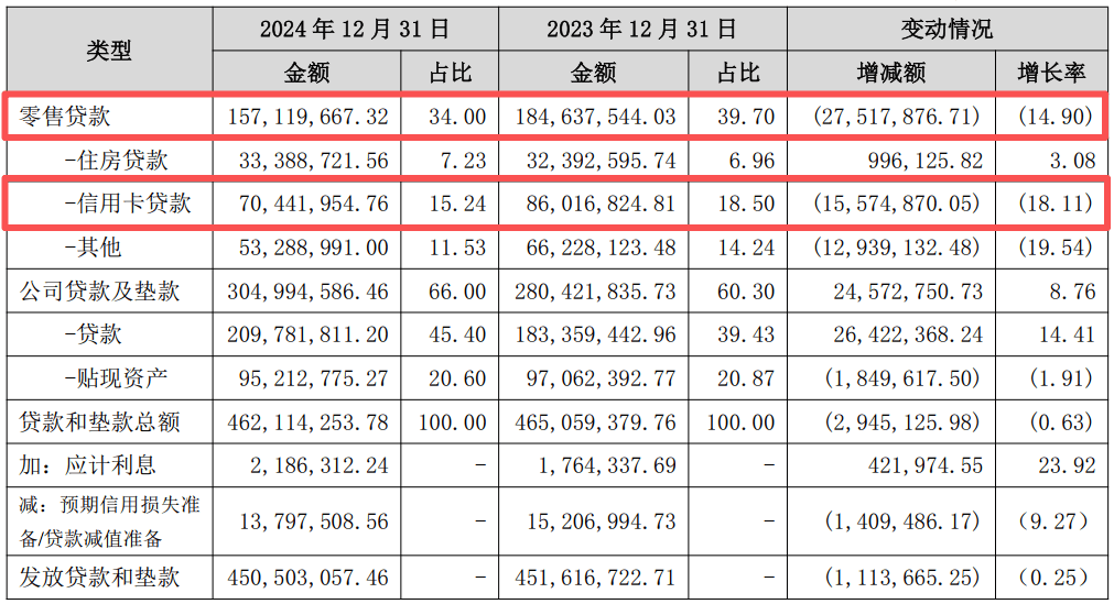 引人注意的是,信用卡贷款占据着该行零售信贷的最大比重。2024年末,该行信用卡贷款704.42亿元,同比下滑18.11%,但在零售信贷的占比达到44.83%。