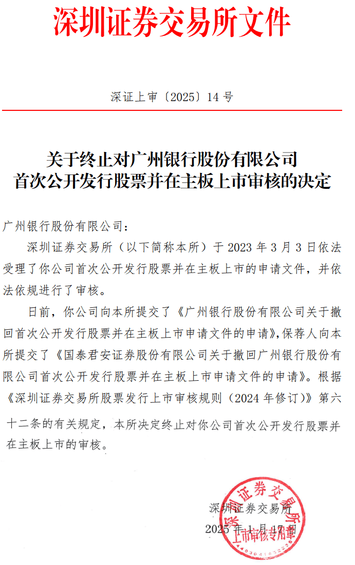 (图 / 深交所有关终止广州银行IPO审核的公告(来源:深交所网站))