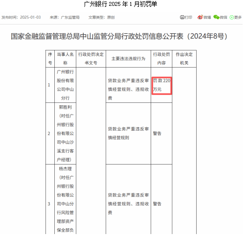 此外,广州银行的罚单问题亦不容忽视。今年1月,该行中山分行因贷款业务严重违反审慎经营规则、违规收费被罚款220万元,10名责任人被予以警告。