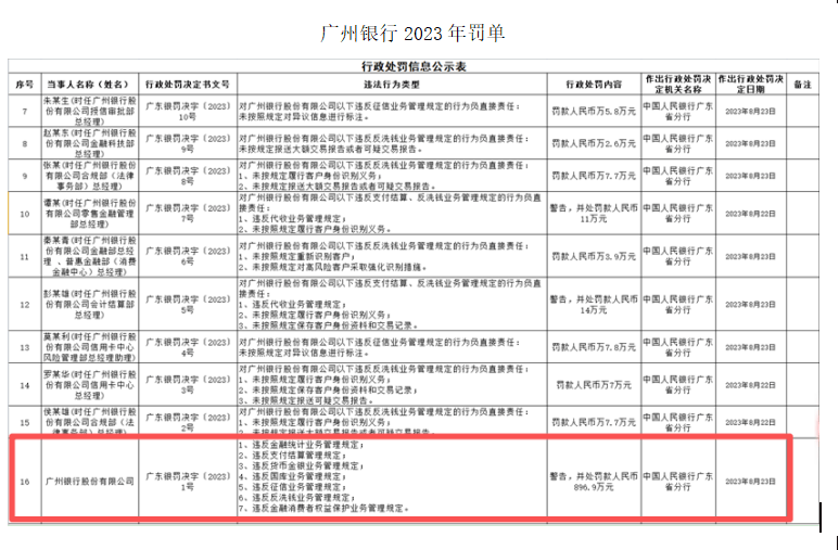 此前在2023年8月,中国人民银行广东省分行对该行开出了896.9万元的高额罚单,多人被处罚,原因是违反金融统计业务管理等七项规定。