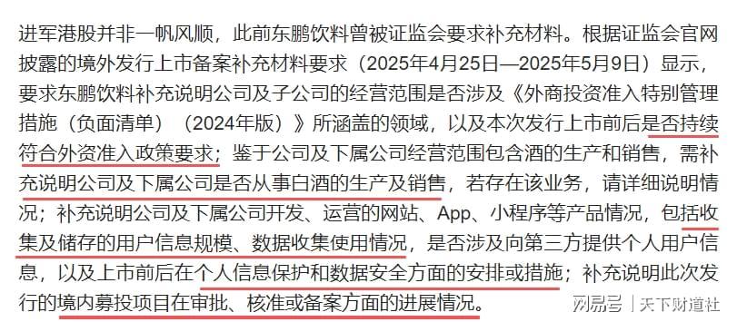 据证监会官网披露的信息显示,有关部门要求东鹏饮料补充材料,内容涉及外资准入、白酒的生产及销售、用户个人信息保护、境内募投项目进展等多维度材料。相关报道对此也有提及。