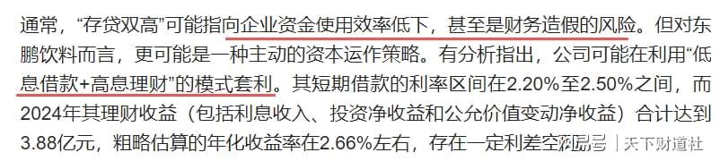 对于东鹏饮料“存贷双高”的现象,有报道认为,这可能是公司试图通过“低息借款+高息理财”模式进行套利,不过这种方式存在潜在风险。比如,一旦市场利率出现波动或理财产品本身出现预料之外的变化,都可能引发连锁反应。