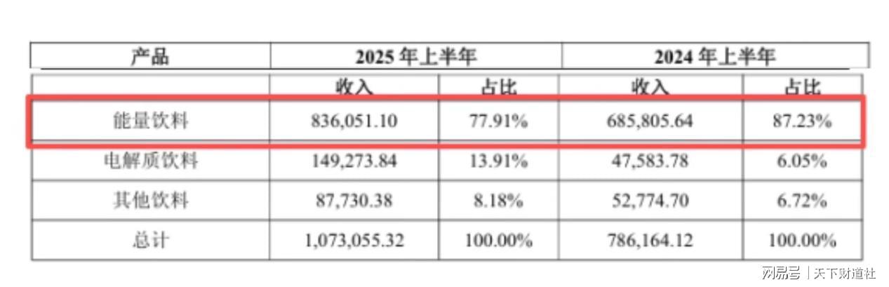 深入分析东鹏饮料产品营收结构后发现,对能量饮料的高度依赖,风险同样不容忽视。2022年至2024年,能量饮料收入占比分别高达97%、92%、84%。截至2025年上半年,仍高达78%,产品结构单一的风险持续存在。