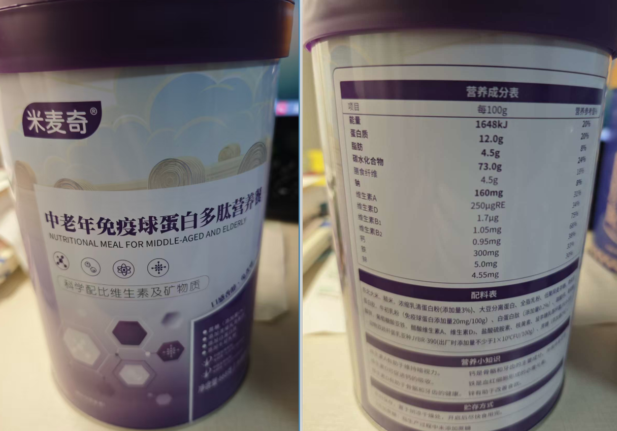 在米麦奇旗舰店,一款标称“江西领培生物科技有限公司”委托“江西康肽普惠医药健康科技有限公司”生产的“米麦奇”牌中老年免疫球蛋白多肽营养餐,在商品页面写有“米麦奇x南昌华南中医医学研究中心联合出品”,“双蛋白中老年营养餐,全面营养,守护健康”,“鼻饲流食、术后饮食、糖尿可食”。