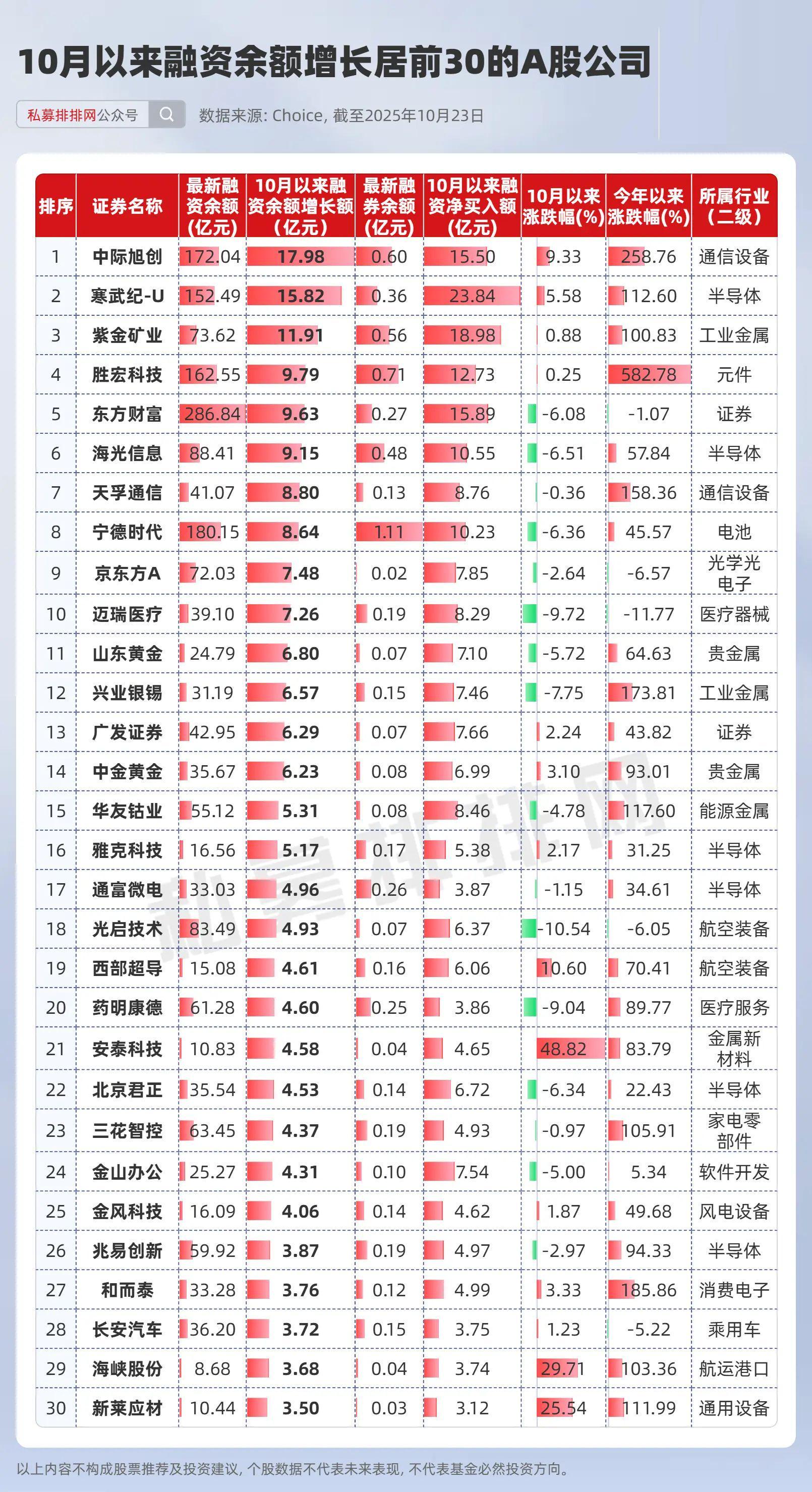 在最新的融资余额增长前30的A股公司中,共有15家公司融资余额增长5亿以上。其中,有3家公司融资余额增长10亿以上,分别为中际旭创、寒武纪、紫金矿业。