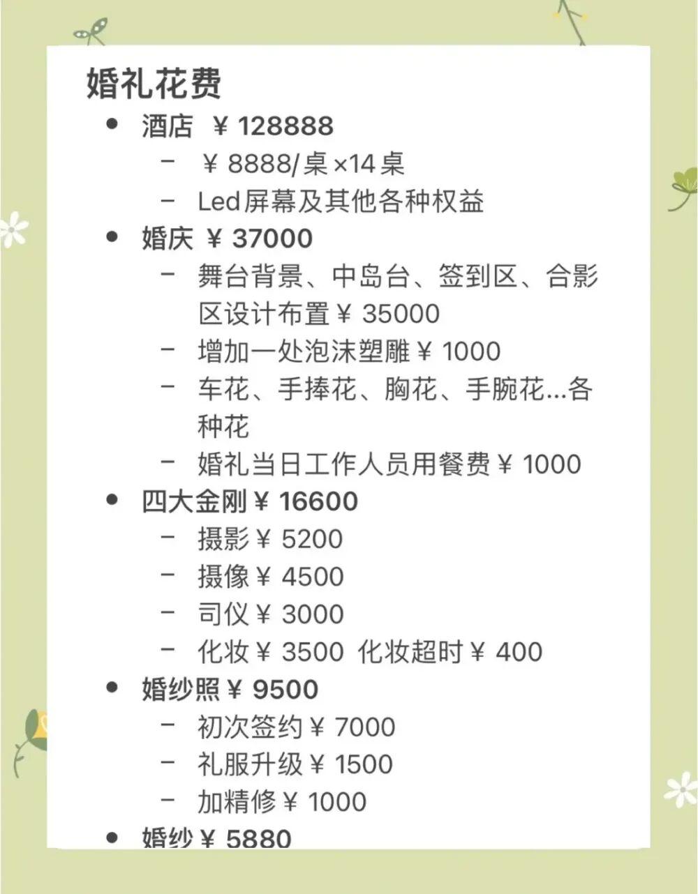 此外,和婚宴配套的“四大金刚”(摄影、摄像、主持人和化妆师),也是宰新人一刀的大头。一场婚礼的聘请费用可达3万元,但实际执行人员所得可能还不到一半。酒店和婚庆公司之所以敢于如此“霸道”,正是抓住了新人“一辈子就一次”“不想破坏喜庆气氛”的心理。尤其是现在的90后、00后结婚,父母和新人都普遍看重面子,觉得婚礼办不好,以后在同学、亲友面前低了档次。