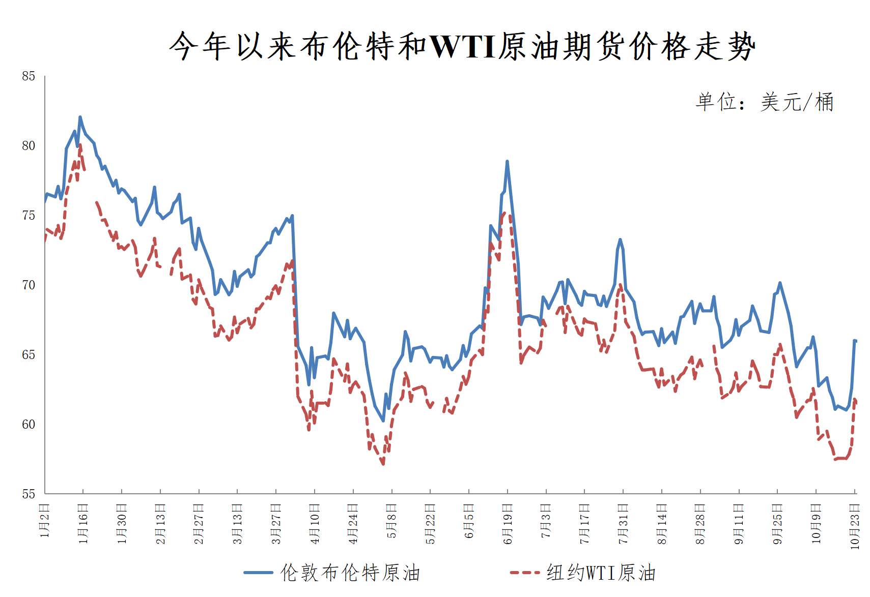 调价周期内,国际油价经历剧烈波动。前期受中东地缘政治缓和影响,以色列与巴勒斯坦达成停火协议,胡塞武装与美国在红海地区达成休战,市场风险溢价快速消退。同时,全球经贸不确定性增加,叠加"欧佩克+"持续增产,导致国际油价承压下行,伦敦布伦特原油期货一度跌至61美元/桶,创近半年新低。