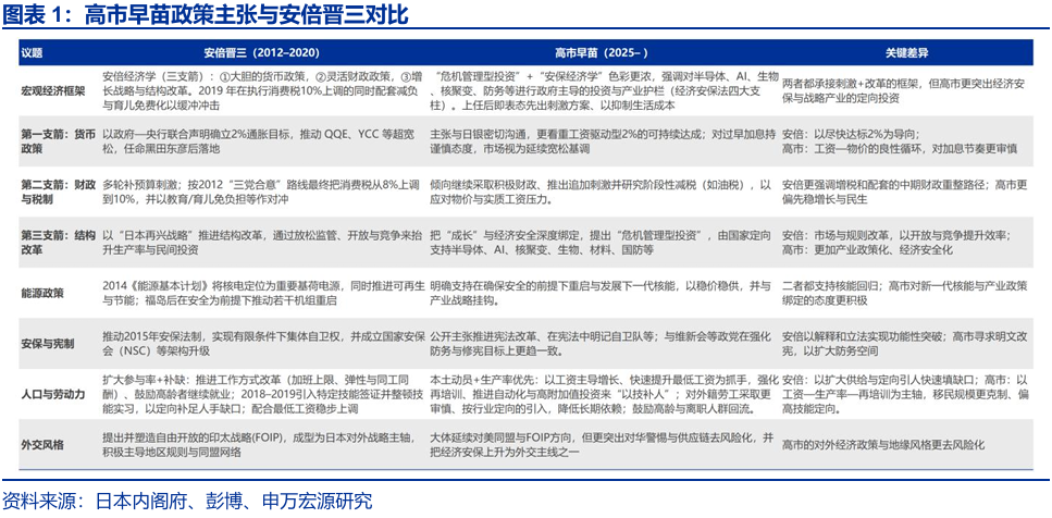 第三支箭,结构改革方面,安倍以“日本再兴战略”推进结构改革,通过放松监管、对外开放来提升私人投资;高市则将第三支箭明确为危机管理型投资,强调对半导体、AI、生物、核聚变、防务等领域进行政府主导的投资。安倍的政策更注重市场与规则改革,高市的主张更具有产业政策色彩。