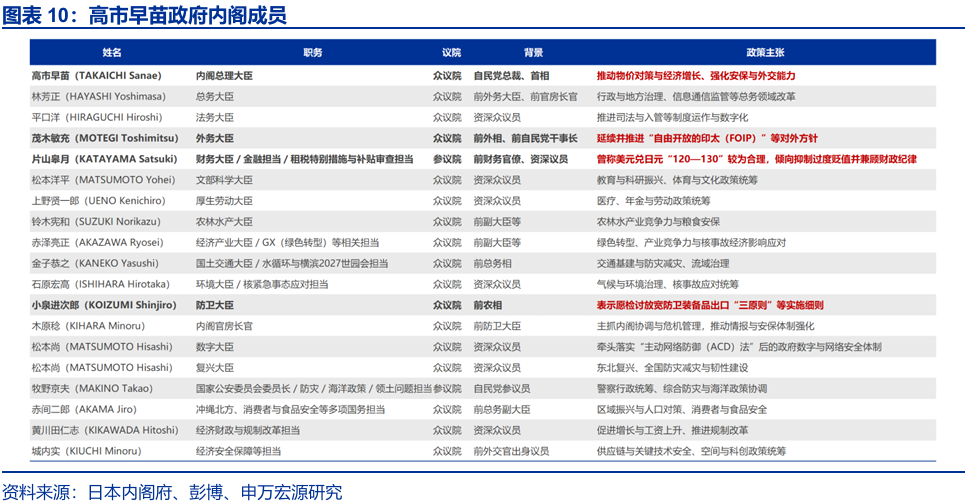 早苗经济学面临更强的内外部约束,政治基础有待巩固。1)执政党国会席位占比仅49.7%,远低于安倍的67.9%;2)高市支持率仅44%,安倍同期达60%;3)内阁及自民党人事受麻生派制约;4)安倍时期的全球低通胀、低利率创造了顺风环境,高市则要兼顾通胀与金融稳定。