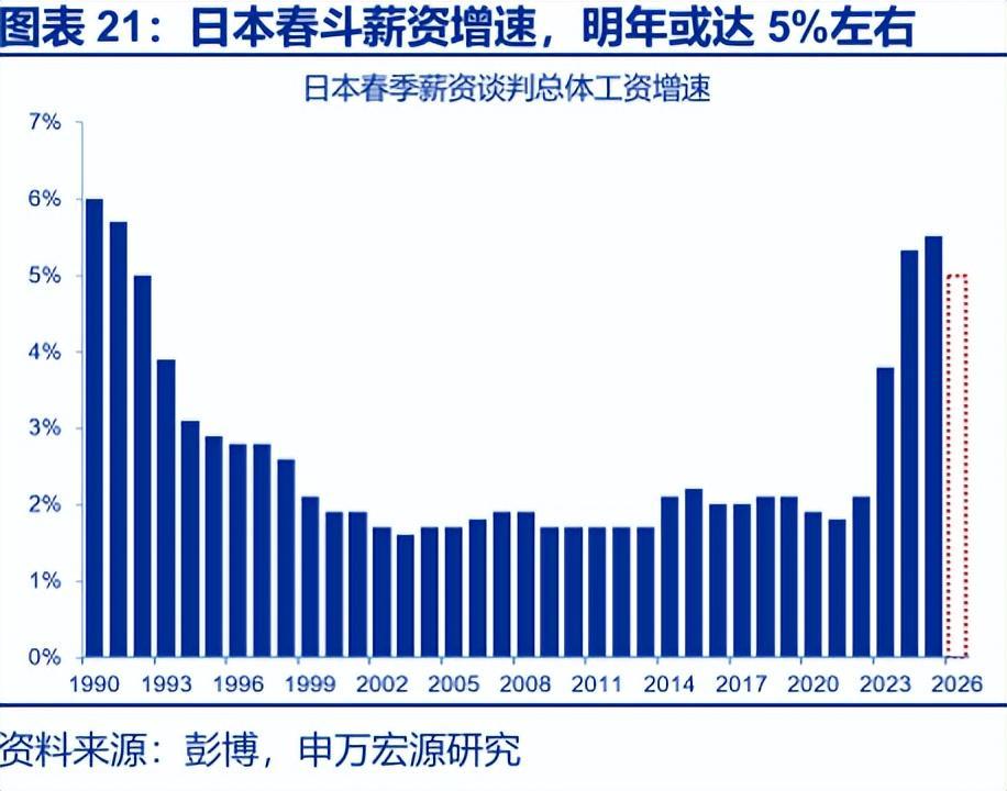 高通胀和弱日元是2026年日央行继续加息的双重约束,关注明年初日央行会否重启加息进程。日央行加息显著“落后于曲线”,今年由于国会选举和内阁重组再次推迟。这是日本通胀粘性的重要解释(日元贬值10%约抬升通胀0.3个百分点)。明年春斗涨薪预期仍在5%左右;