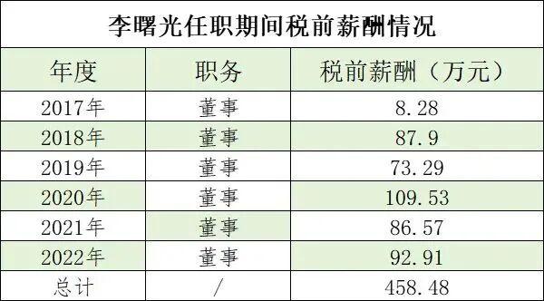 据《国际金融报》记者统计,在五粮液任职期间,李曙光以董事职务共获得薪酬458.48万元。赴任首年即2017年,李曙光薪酬从6月开始领取,共8.28万元,次年便跳涨至87.9万元;2020年为最高水平,达到109.53万元;离任的2022年,共领取92.91万元。