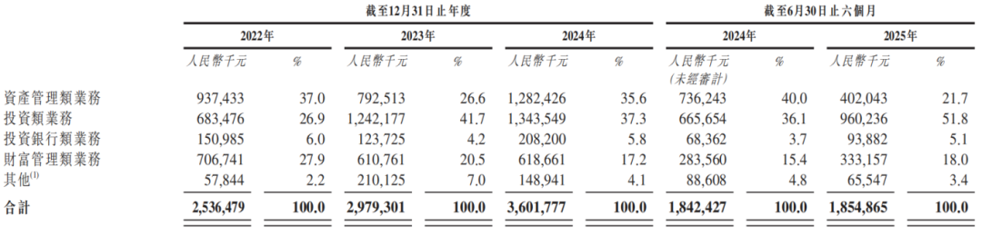 首创证券的业务结构主要分为四类:资产管理类、投资类、投资银行类和财富管理类。其中,资管与投资类业务构成了公司的核心收入来源,合计收入占比从2022年的63.9%逐步升至2023年的68.3%,再增至2024年的72.9%。