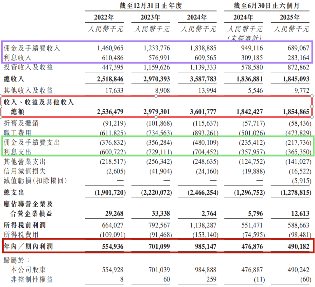 据招股书披露,2022年至2024年,首创证券的总收入分别约为25.37亿元、29.79亿元和36.02亿元,三年合计达到了91.18亿元,年复合增长率高达19.2%。同期,公司的归母净利润也分别约为5.55亿元、7.01亿元和9.85亿元,年复合增长率更是达到了33.2%,三年利润总计22.41亿元。而在2025年上半年,公司更是录得了总收入约18.55亿元、净利润约4.90亿元的佳绩。