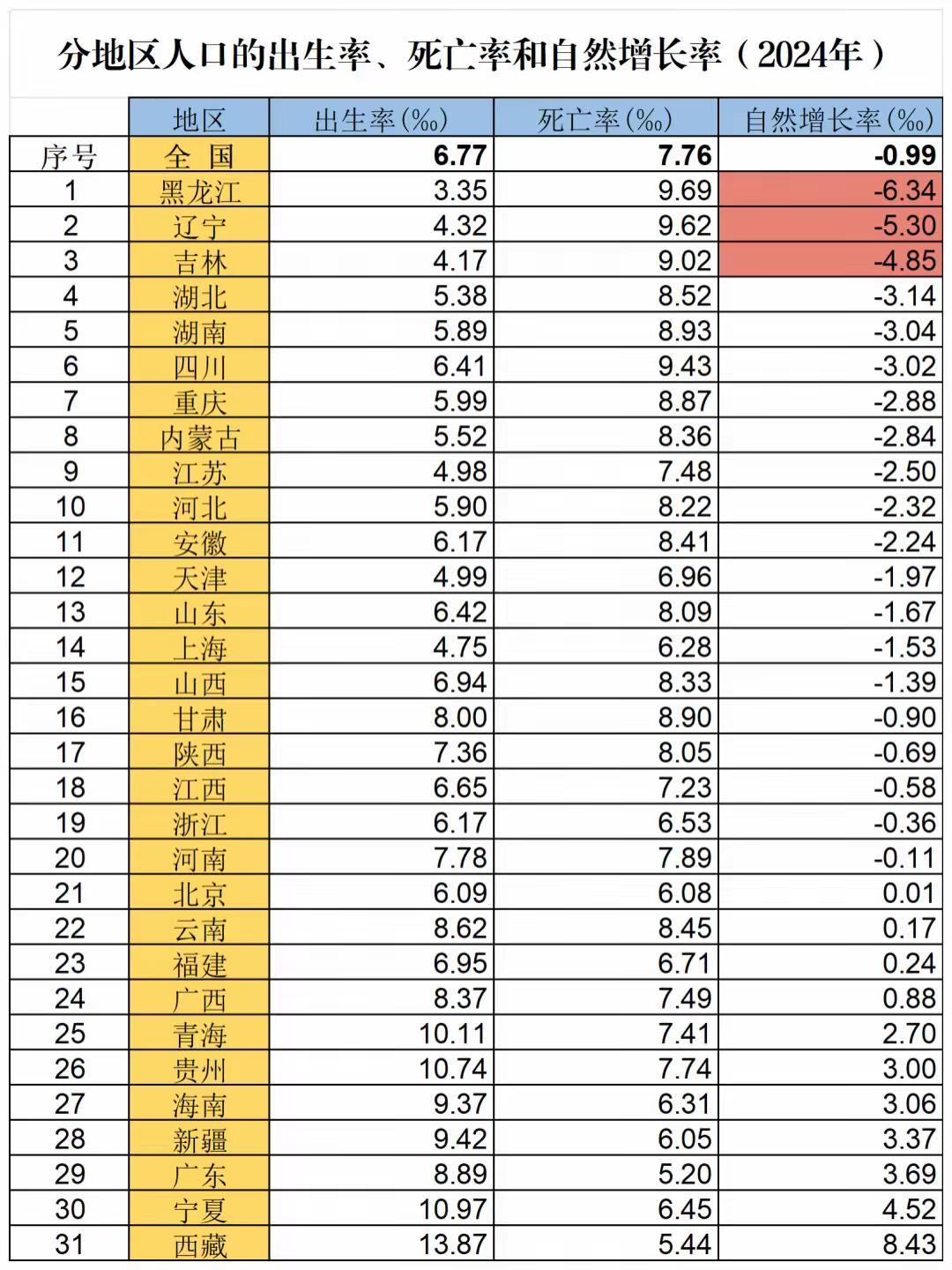 然而,有愿意生的地方,就有不愿生的地方。黑吉辽三省继续稳坐出生率倒数前三的宝座,其中黑龙江的出生率更是低至3.35‰,几乎要跌破3字头。更令人担忧的是,上海、江苏、天津的出生率也不到5‰,已经出现了“人口东北化”的迹象。此外,出生率不到6‰的还有湖北、内蒙古、湖南、河北、重庆等地。