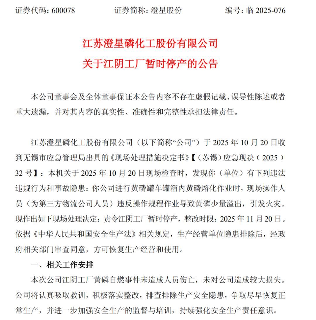 10月22日,澄星股份发布停产公告,原因是厂区突发黄磷自燃事故。此次事故对刚刚摆脱亏损困境的澄星股份的声誉和市场信心带来一定损伤,股价随即下跌9.48%。尽管如此,李星星在三年时间内将一度巨亏23.4亿元的澄星股份扭亏为盈,证明其管理能力优异。