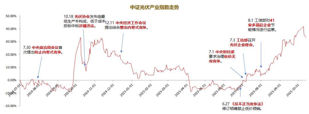 经历两年深度调整后,光伏板块在2025年夏季展现强劲复苏态势。6月企稳回升后,10月9日节后首日即录得4.2%涨幅,为全年收官奠定积极基调。这轮反转的核心驱动力,源自国家层面系统性的'反内卷'政策组合拳。