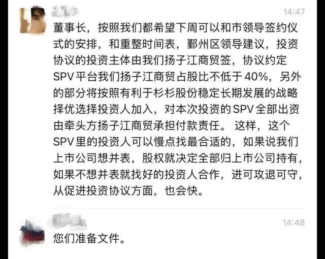 实际上,管理人不仅为投资人“出谋划策”,还在杉杉集团重整投资协议中做出了“关键安排”。据债权人中间流传的一张疑似管理人跟扬子江商贸负责人的对话截图显示,扬子江商贸在做好协议约定后,可享受“选择其他投资人”的权利,并且还可以自由选择“并表或者不并表”。尤其是那句“进可攻退可守”,更是为投资人资本套利的后路都想好了。