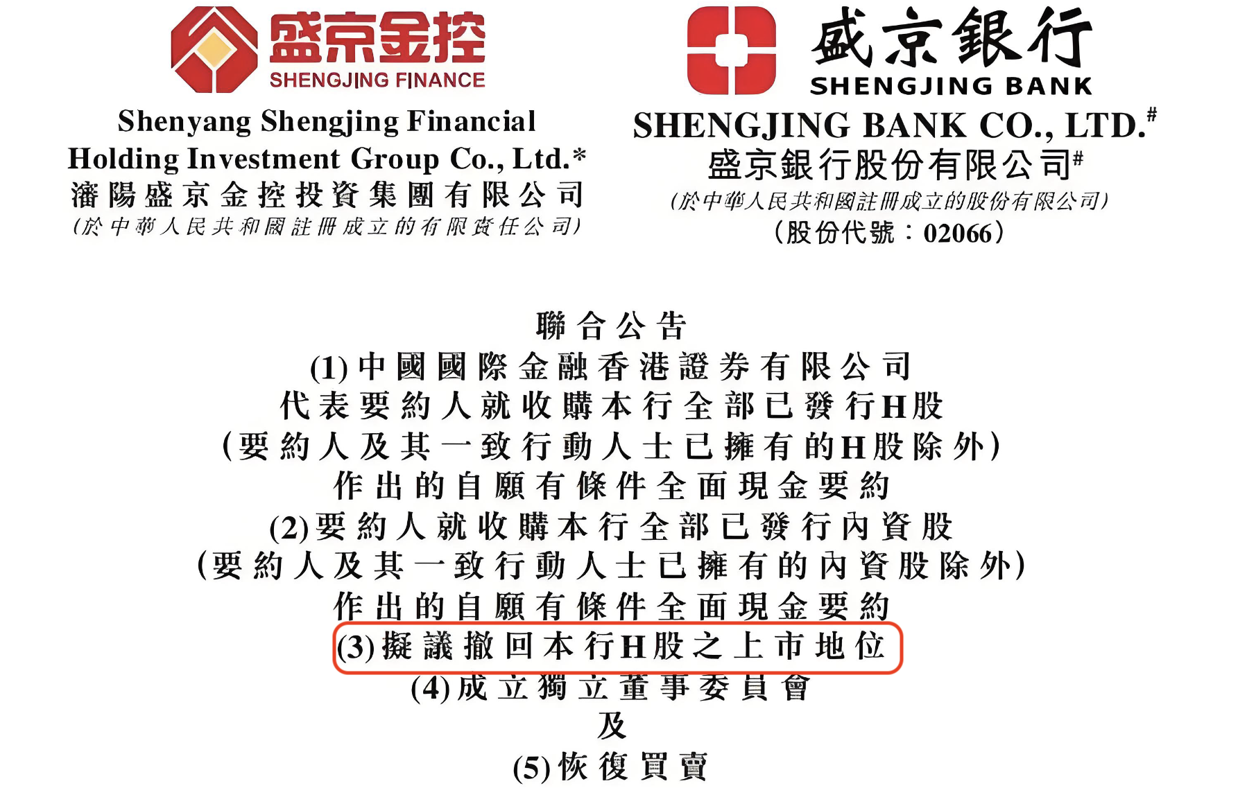 2025年8月26日,盛京银行和盛京金控联合发布公告,宣布盛京金控及一致行动人发起全面现金要约,收购全部流通H股和部分内资股,以最终实现从港交所退市。公告给出的理由,一是为了给股东提供更好的投资变现机会;二是目前的上市地位不再为银行经营提供切实可行的融资渠道,从H股退市有利于优化资源配置。