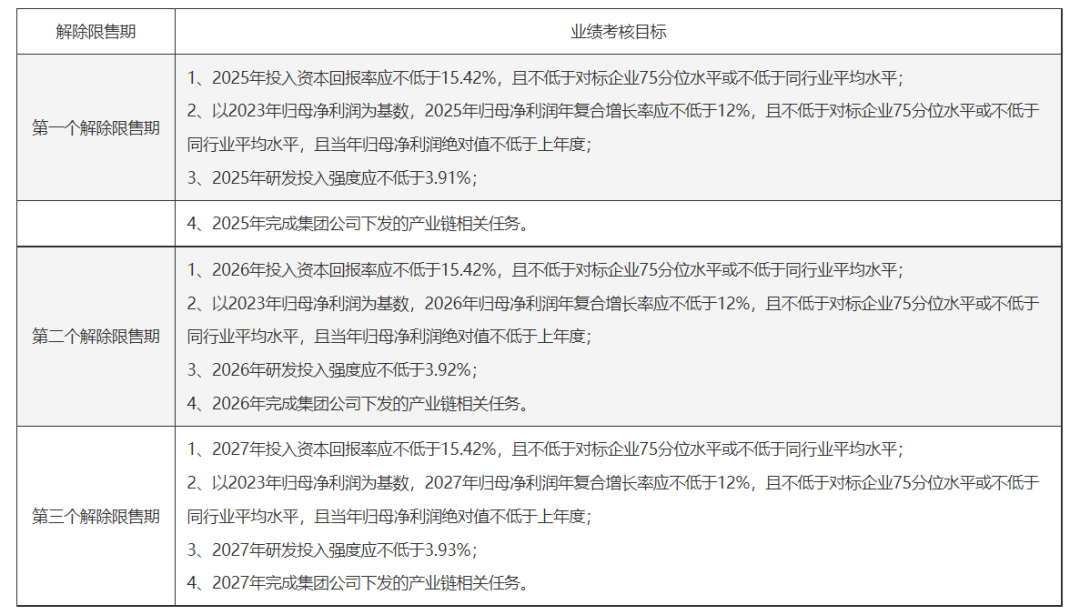 具体来看,三期解除限售期业绩考核条件中,要求投入资本回报率均应不低于15.42%,且不低于对标企业75分位水平或同行业平均值;均以2023年归母净利润为基数,2025-2027年归母净利润年复合增长率应不低于12%,且不低于对标企业75分位水平或同行业平均值;2025-2027年,研发投入强度应分别不低于3.91%、3.92%、3.93%;同期均要求完成集团公司下发的产业链相关任务。