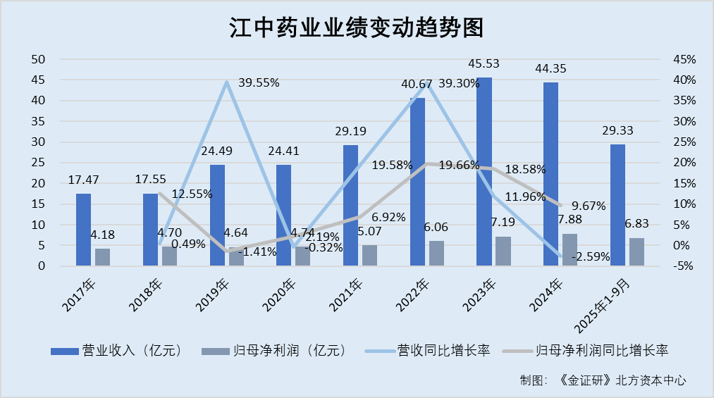 根据《金证研》北方资本中心研究,2018-2024年,江中药业营业收入增速分别为0.49%、39.55%、-0.32%、19.58%、39.3%、11.96%、-2.59%,归母净利润增速分别为12.55%、-1.41%、2.19%、6.92%、19.66%、18.58%、9.67%。
