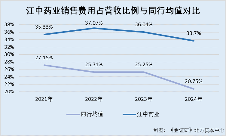 近年来,上市药企销售费用持续受到监管机构和投资者关注。在此背景下,江中药业2022-2024年销售费用占营收比例高于同行均值。且其2024年销售费用中营销开支及广告宣传促销费合计超12亿元,占销售费用比例上升至84.65%。