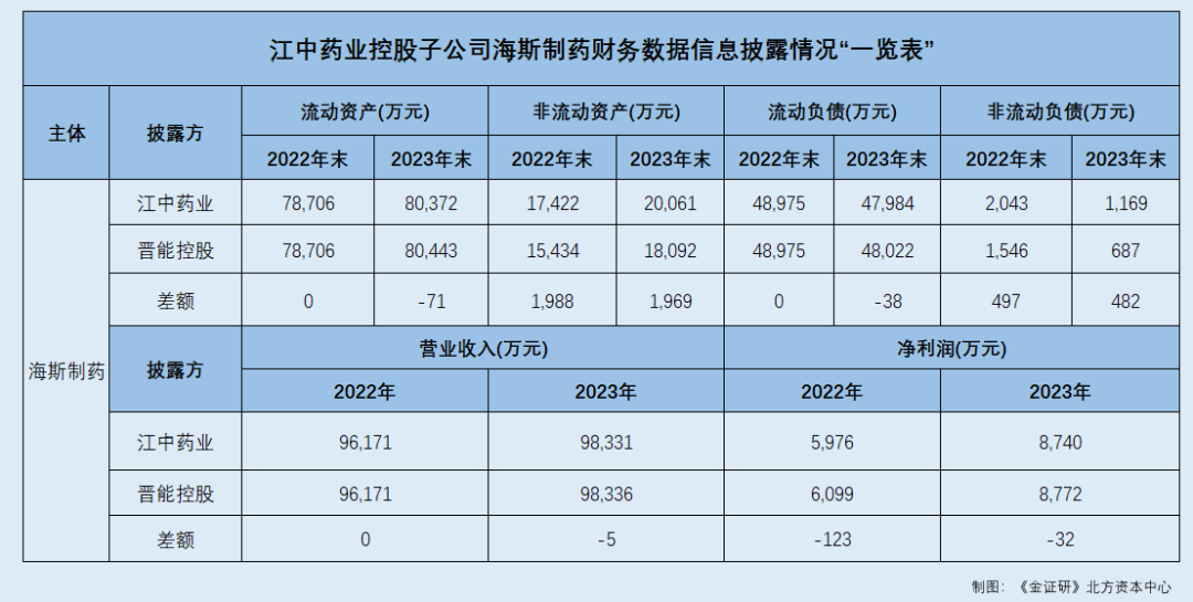 根据《金证研》北方资本中心研究,如果不保留小数点,江中药业披露海斯制药2022年的流动资产、流动负债、营业收入,均与晋能控股披露的海斯制药同期财务数据一致。在此情况下,江中药业披露海斯制药2022年的非流动资产、非流动负债、净利润,分别较晋能控股披露的海斯制药同期财务数据多1,988万元、多497万元、少123万元。