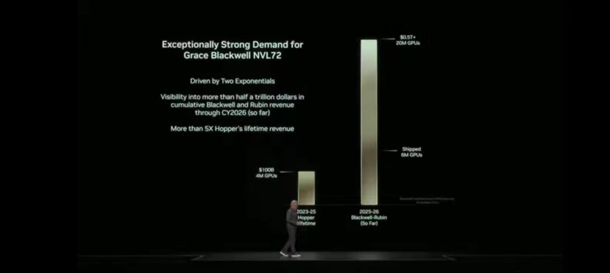 黄仁勋在演讲中抛出震撼预测:基于Blackwell和Rubin两大芯片架构,英伟达2025-2026年将实现超5000亿美元收入,对应2000万颗GPU出货量(目前已出货600万颗)。这一数字是2023-2025年Hopper架构芯片收入的5倍。生产方面,Blackwell芯片已在亚利桑那州全面量产,下一代Rubin架构芯片预计2026年10月前投产。