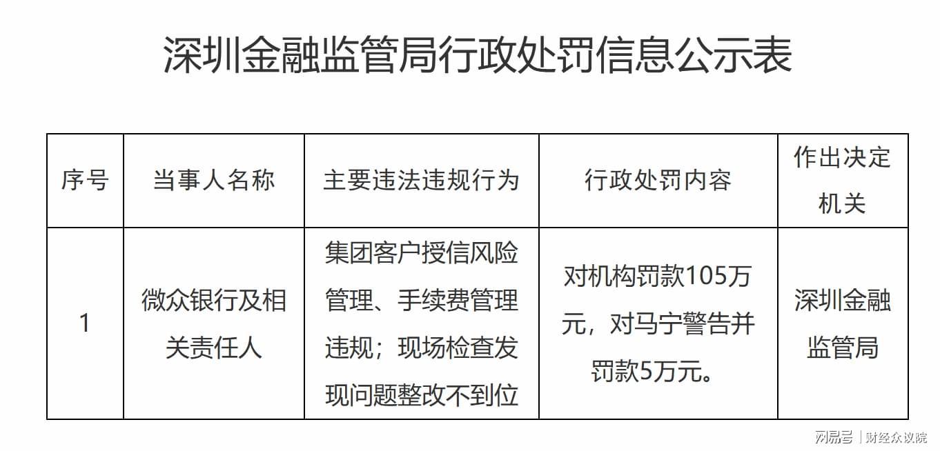 深圳金融监管局的一纸罚单,再次将民营银行龙头微众银行推上风口浪尖。尽管行长李南青亲自兼任首席合规官,该行仍因集团客户授信风险管理、手续费管理违规及整改不到位等问题,被处以105万元罚款,相关责任人马宁同步被警告并罚款5万元。