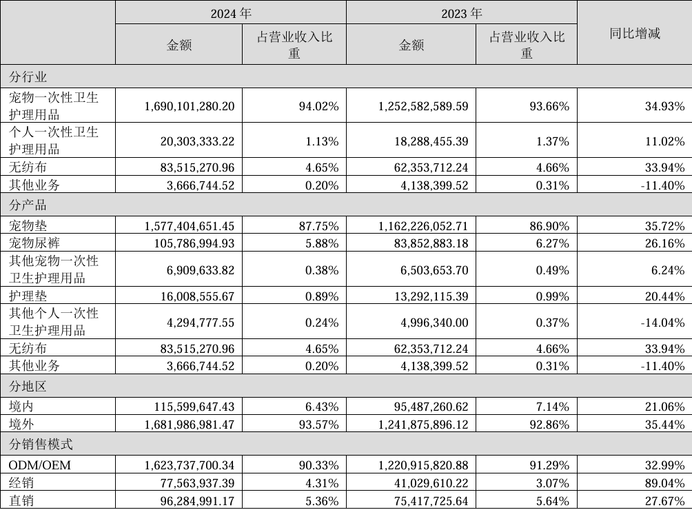 对比历史数据可见,2025年上半年公司营收8.88亿元(同比+9.34%)、归母净利润1.02亿元(同比+7.37%)的增速,已较2024年同期营收增29.31%、净利润增111.71%的表现大幅回落。这种增长乏力与业务结构高度依赖境外市场密切相关——2024年财报显示,其境外营收占比高达94%,主要产品为宠物垫、尿裤等卫生用品。