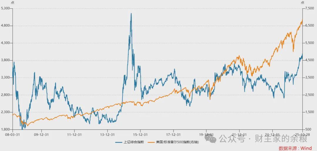 对比同时期的美国股市,标普500指数从1300点涨至6800点,点位涨至原来的5倍还多。尽管我们的经济增长速度和货币增长速度都远远高于美国,但股市上涨点位却远远低于美国。