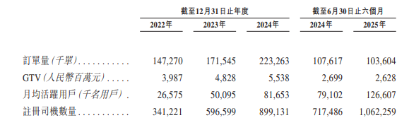 2022年至2025年上半年,享道出行订单量分别为1.47亿单、1.7亿单、2.2亿单及1.036亿单,其中来自聚合平台的订单占比达90%以上。同期GTV分别为39.9亿元、48.3亿元、55.4亿元及26.3亿元,月均活跃用户从2660万增长至1.266亿,注册司机数量从34.1万增至106.2万。