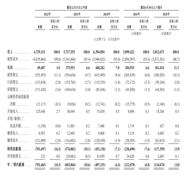 从客户结构看,2022年至2025年上半年,前五大客户收入占比从6.8%降至4%,其中最大客户上汽集团收入占比从3.6%降至1.1%。运营成本方面,销售成本占收入比例从99%降至88.7%,研发开支从1.71亿元降至0.45亿元,销售开支从5.26亿元增至3.1亿元。