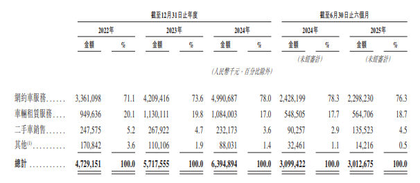 财务数据显示,2022年至2025年上半年,享道出行收入分别为47.29亿元、57.18亿元、63.95亿元及30.13亿元,复合年增长率16.3%。其中网约车服务收入占比分别为71.1%、73.6%、78%及76.3%,车辆租赁服务占比约18%-20%,二手车销售占比不足5%。